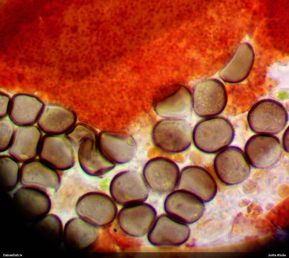 Sporas izskatās ļoti gaišas, varbūt nenobriedušas. Es laikam pēc kāda laiciņa mēģinātu vēlreiz mikroskopēt. Tajā pašā laikā sporu izmēri priekš T.contorta ir pamazi (ja tipiski ir 11-14 mkm, te ir knapi 11 mkm)