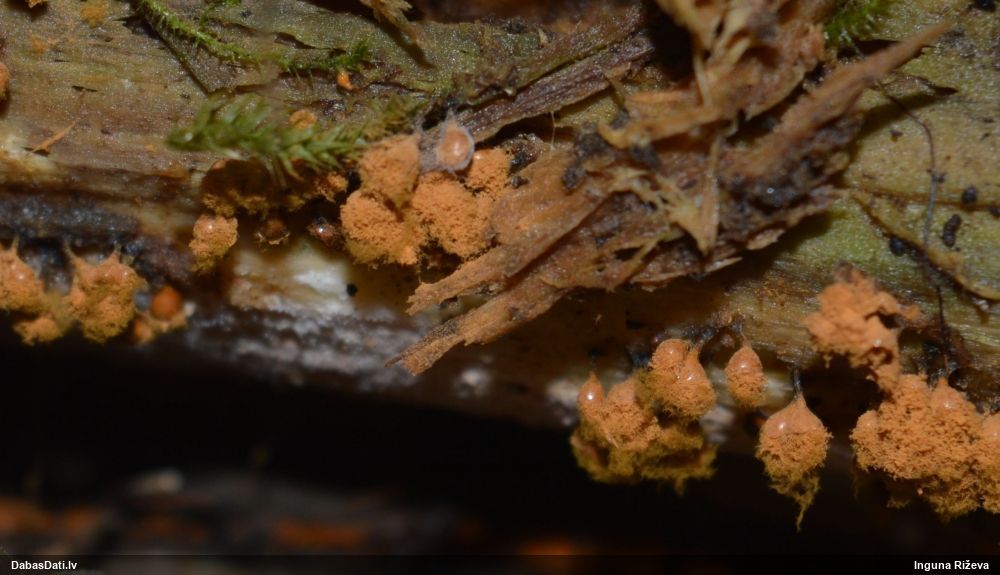 Paldies, Raivo! Ar acu gaišumu man arvien sliktāk, bet mikroskops palīdz. Jā, gribēju teikt, ka paraugam, ja vien nav kāda jutīga atradne, kurai drīkst ievākt tikai mazu gabaliņu, vērts ievākt lielāku gabalu, jo gļotsēnēm patīk kompānija. Un mikroskopa mazajos palielinājumos ar sānu papildus apgaismojumu ir vērts rūpīgi "izstaigāt" visu paraugu. Arī ķērpjus un interesantas sīksēnītes tā var atrast, ko dabā nepamanītu. Ar kriksītēm ir dažādi - pirmās es tā arī tikai citu sugu paraugos pamanīju, bet vēlāk redzēju arī dabā kriskīšu plantācijas - ja to ir daudz, tad var pamanīt jau dabā. Uz sūnām gan ir ekstrēms gadījums, dabā droši nepamanītu, arī eksemplāra noņemšana no sūnas nebija pārāk veiksmīga, tāpēc par noteikšanu mazliet šaubos (sporām mazliet cits tonis). Bet pagaidām citas hipotēzes nav (un konkrētā eksemplāra arī vairs ne).