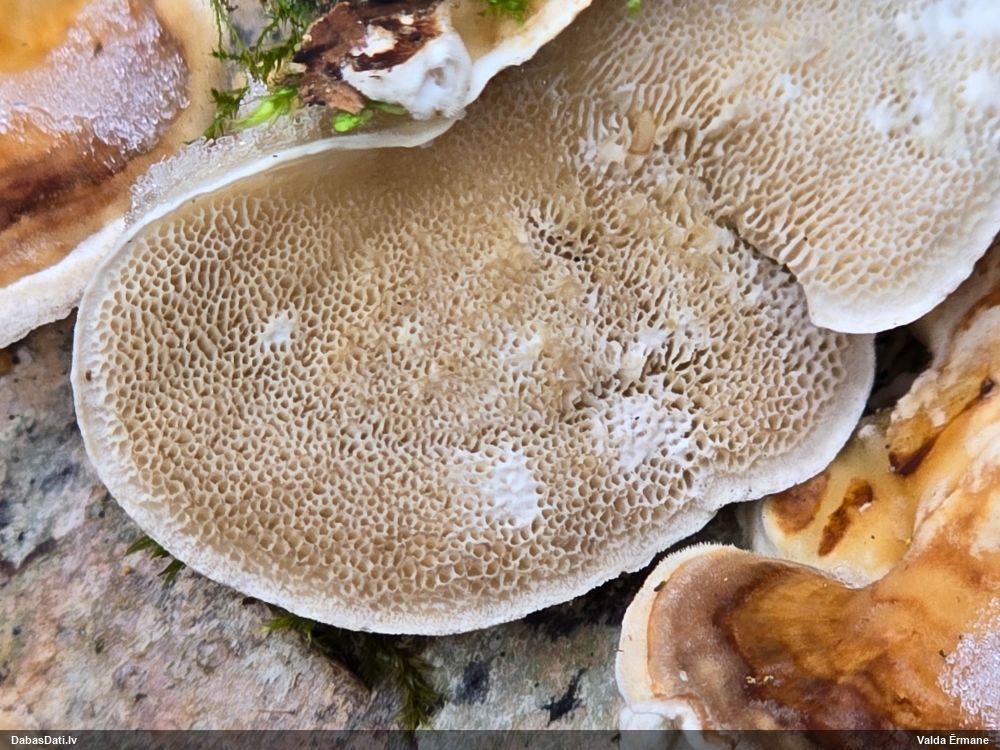 Ja uz beigta koka, tad ticamākā laikam ir B.affinis var. microspora, lai gan tā aug uz mizas. Bet varbūt tieši apakšā gļotsēnēm ir kādi mizas fragmentiņi?