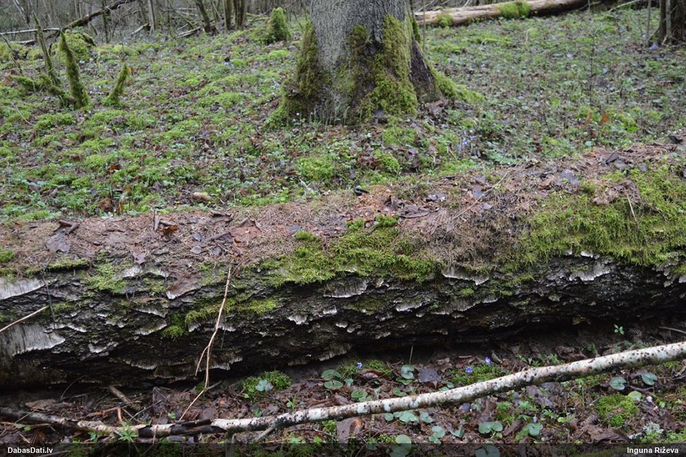 Satrūdējusi kritala mežā, nav dēļi. Iespējams, egle, jauktu koku mežs.