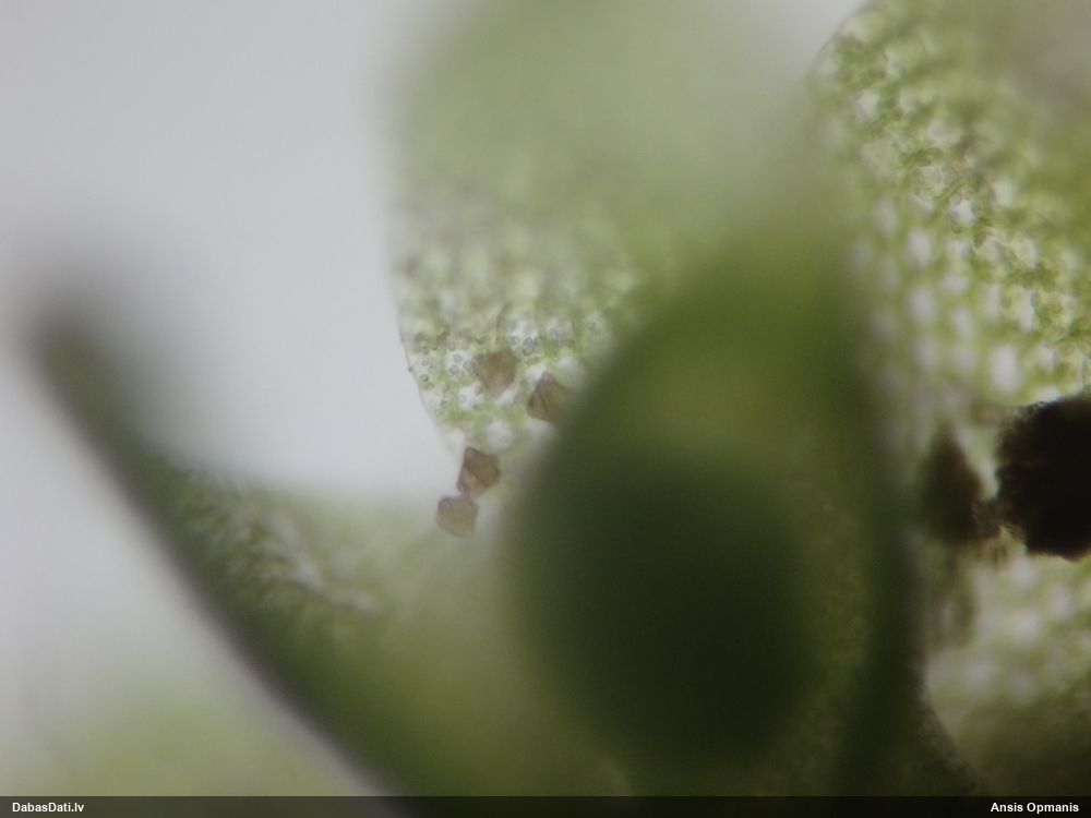 Paldies, Raivo! Ar acu gaišumu man arvien sliktāk, bet mikroskops palīdz. Jā, gribēju teikt, ka paraugam, ja vien nav kāda jutīga atradne, kurai drīkst ievākt tikai mazu gabaliņu, vērts ievākt lielāku gabalu, jo gļotsēnēm patīk kompānija. Un mikroskopa mazajos palielinājumos ar sānu papildus apgaismojumu ir vērts rūpīgi "izstaigāt" visu paraugu. Arī ķērpjus un interesantas sīksēnītes tā var atrast, ko dabā nepamanītu. Ar kriksītēm ir dažādi - pirmās es tā arī tikai citu sugu paraugos pamanīju, bet vēlāk redzēju arī dabā kriskīšu plantācijas - ja to ir daudz, tad var pamanīt jau dabā. Uz sūnām gan ir ekstrēms gadījums, dabā droši nepamanītu, arī eksemplāra noņemšana no sūnas nebija pārāk veiksmīga, tāpēc par noteikšanu mazliet šaubos (sporām mazliet cits tonis). Bet pagaidām citas hipotēzes nav (un konkrētā eksemplāra arī vairs ne).