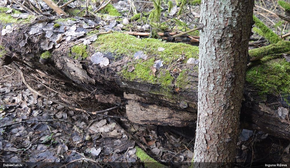 Satrūdējusi kritala mežā, nav dēļi. Iespējams, egle, jauktu koku mežs.