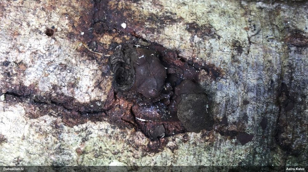 Šobrīd varu iedomāties 2 variantus - melnā plaispika Amaurochaete atra vai parastais gļotpūpēdis Reticularia lycoperdon. Pēc izmēra, augšanas laika un augšanas uz apstrādāta koka atbilst abas.
