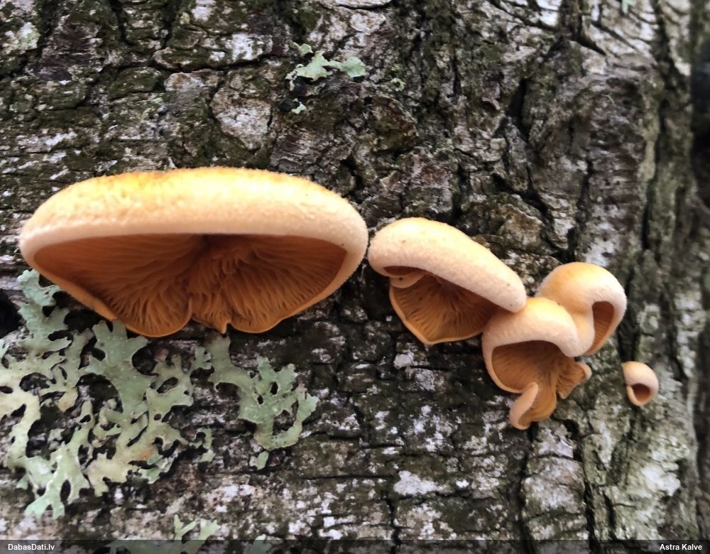 Es teiktu, ka Pleurotus cornucopiae: Cepurītes krāsa tik gaiši bēša nav pat vairākkārt salušām P.osteatus, bet šīs ir svaigi izaugušas. Lapiņas izteikti vērstas uz leju un veido kātiņa apakšā neregulāru rakstu, ko sauc par "anastomozes" tīklu.