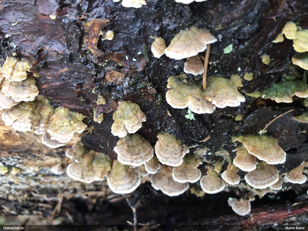 Ja uz beigta koka, tad ticamākā laikam ir B.affinis var. microspora, lai gan tā aug uz mizas. Bet varbūt tieši apakšā gļotsēnēm ir kādi mizas fragmentiņi?