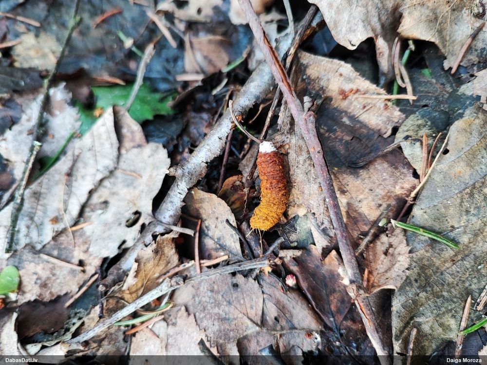 Vai tik nebūs medainā bumbulīte? Augļķermeņi vertikāli izstiepti, sporu mākonis ciešā klājienā.