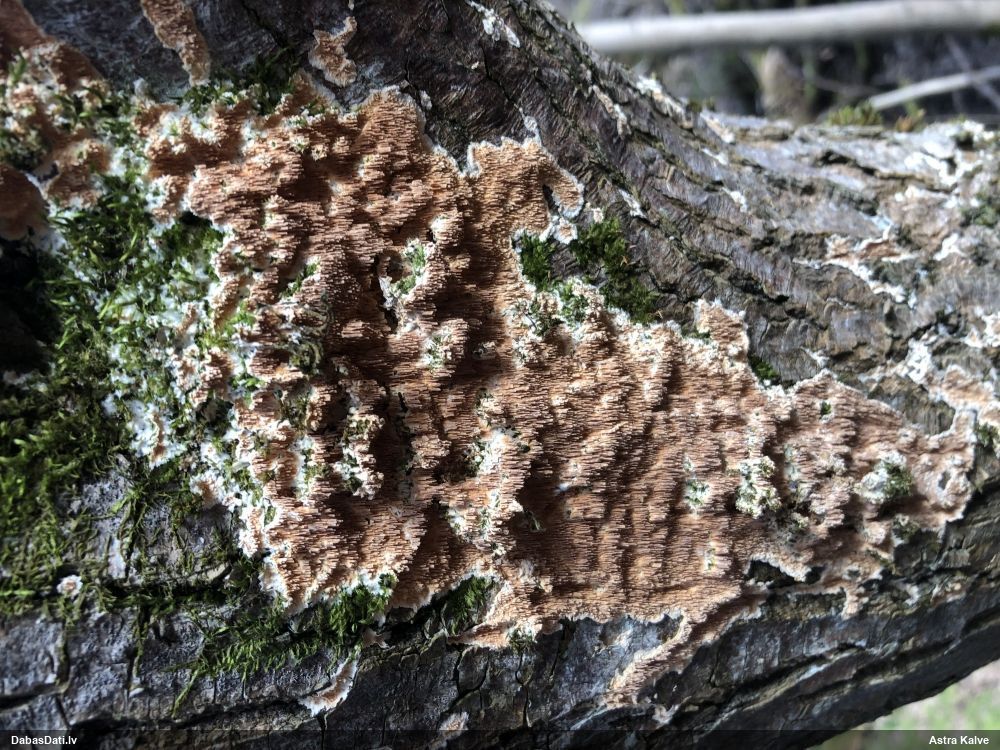 Paldies par paraugu! Paraugā augļķermeņi gan bija ļoti cieti, līdz galam nenobrieduši. Jauna eksemplāra krāsa var būt nozīmīga noteikšanā, bet svarīgi arī nobriedināt (turot mitrākā vietā), citādi perīdiju noņemt mikroskopēšanai ir praktiski neiespējami. Šajā gadījumā mazu gabaliņu izdevās atmiekšķēt un nodabūt, kas sarežģītākos gadījumos varētu būt nepietiekami. Pēc izmēra un perīdija pazīmēm te varētu būt divi varianti L.irregularis un L.epidendrum, kas esot viens no grūtāk atšķiramajiem sugu pāriem. L.epidendrum vairāk raksturīgi, kā es tos saucu, pārstaipi uz augļķermeņa virsmas, kas te ir ļoti labi redzami, tāpēc izšķīros par parastāko sugu.