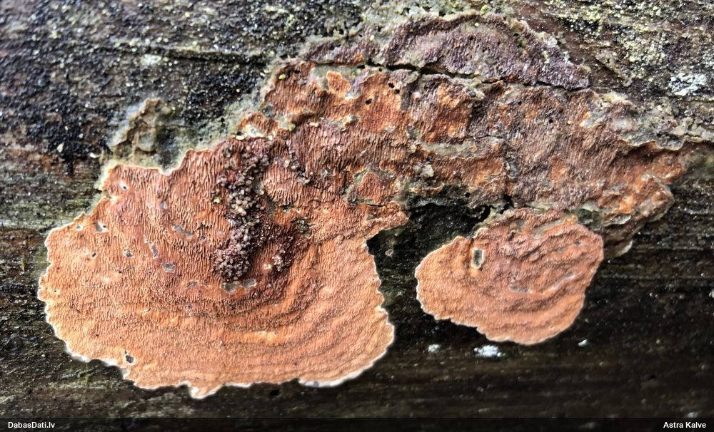 Ja uz beigta koka, tad ticamākā laikam ir B.affinis var. microspora, lai gan tā aug uz mizas. Bet varbūt tieši apakšā gļotsēnēm ir kādi mizas fragmentiņi?