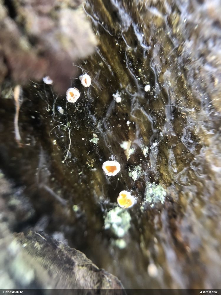 Ja uz beigta koka, tad ticamākā laikam ir B.affinis var. microspora, lai gan tā aug uz mizas. Bet varbūt tieši apakšā gļotsēnēm ir kādi mizas fragmentiņi?