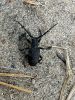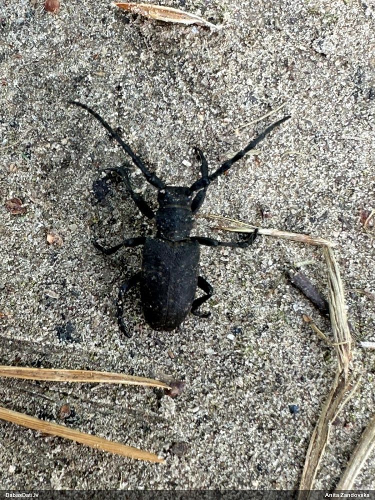 Jāredz tuvāk (kaut vai izkadrēts šis pats attēls) - varbūt tumšā eļļasvabole (Meloe proscarabaeus)