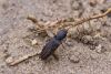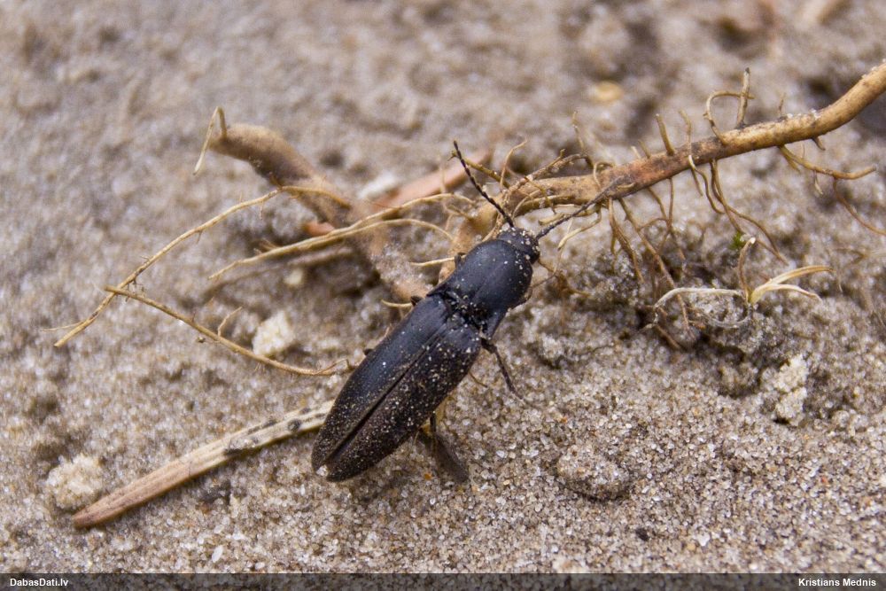 Jāredz tuvāk (kaut vai izkadrēts šis pats attēls) - varbūt tumšā eļļasvabole (Meloe proscarabaeus)