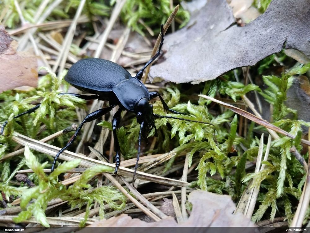 Jāredz tuvāk (kaut vai izkadrēts šis pats attēls) - varbūt tumšā eļļasvabole (Meloe proscarabaeus)
