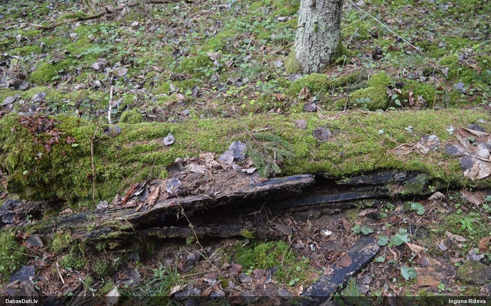 Satrūdējusi kritala mežā, nav dēļi. Iespējams, egle, jauktu koku mežs.