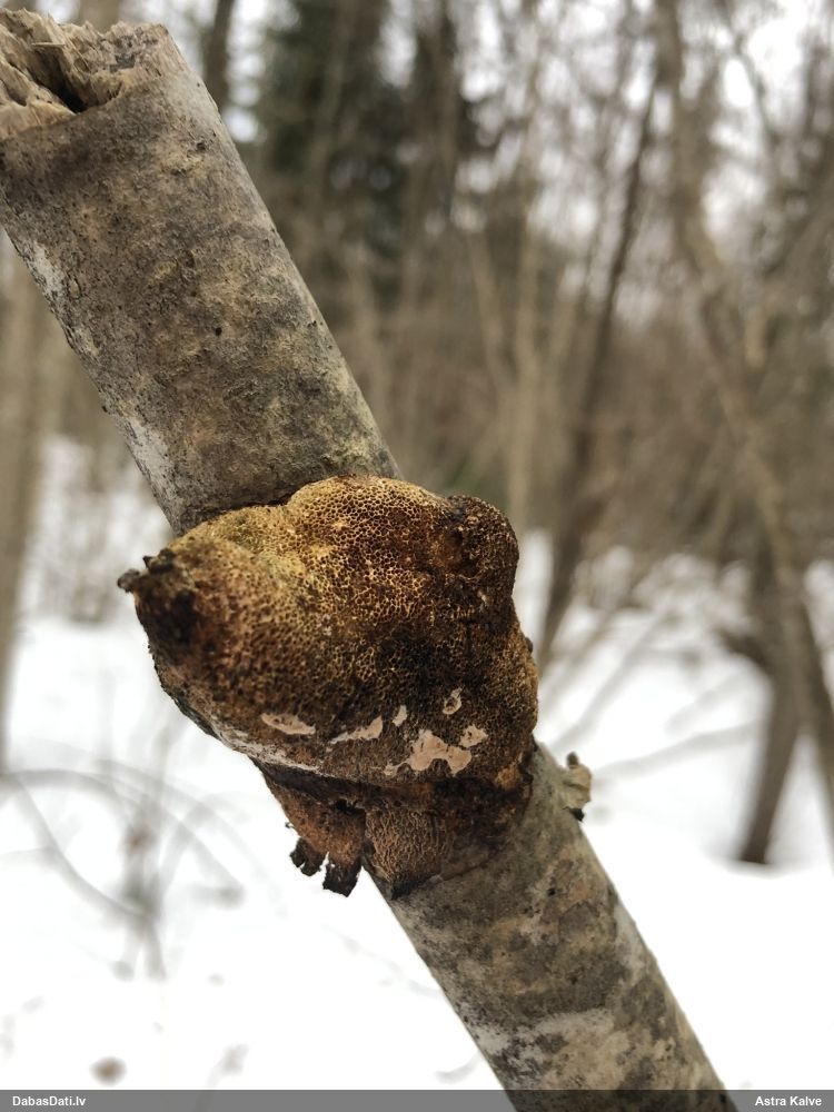 Ja uz beigta koka, tad ticamākā laikam ir B.affinis var. microspora, lai gan tā aug uz mizas. Bet varbūt tieši apakšā gļotsēnēm ir kādi mizas fragmentiņi?