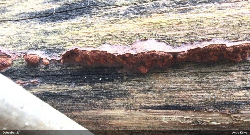 Šobrīd varu iedomāties 2 variantus - melnā plaispika Amaurochaete atra vai parastais gļotpūpēdis Reticularia lycoperdon. Pēc izmēra, augšanas laika un augšanas uz apstrādāta koka atbilst abas.