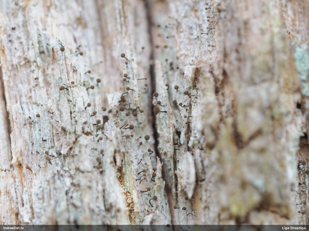Šobrīd varu iedomāties 2 variantus - melnā plaispika Amaurochaete atra vai parastais gļotpūpēdis Reticularia lycoperdon. Pēc izmēra, augšanas laika un augšanas uz apstrādāta koka atbilst abas.