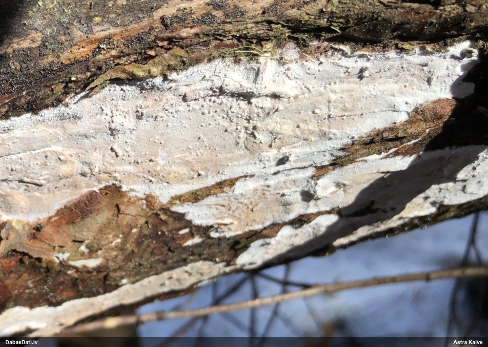 Ja uz beigta koka, tad ticamākā laikam ir B.affinis var. microspora, lai gan tā aug uz mizas. Bet varbūt tieši apakšā gļotsēnēm ir kādi mizas fragmentiņi?