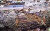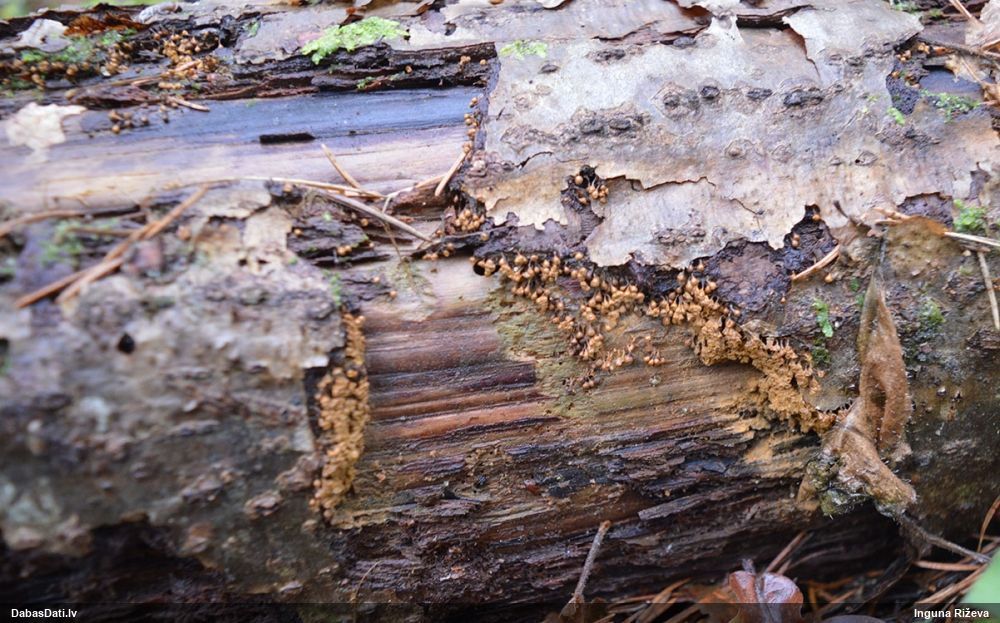 Satrūdējusi kritala mežā, nav dēļi. Iespējams, egle, jauktu koku mežs.
