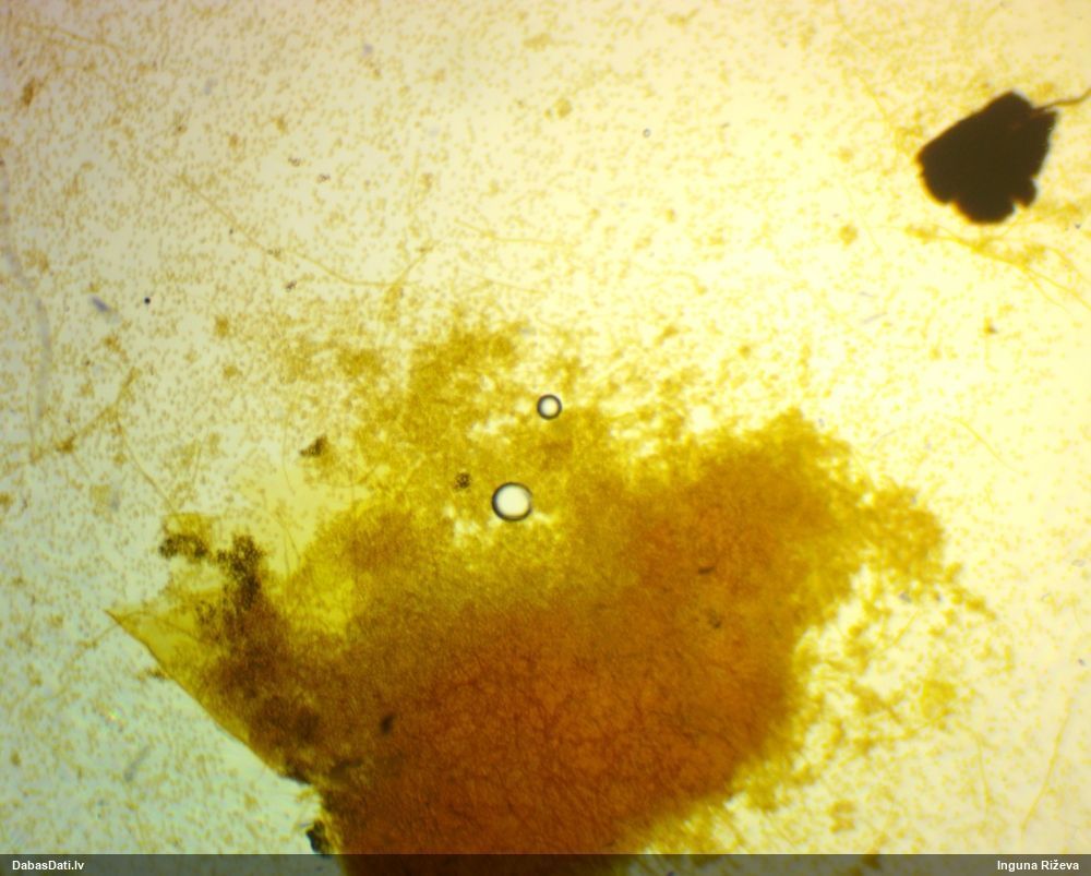 Šis man pašai sanāca pārsteigums. Ievācu paraugu ar domu "varbūt tur ir gļotsēne", dodot varbūtību apmēram pusprocentu, ka ir. Bet no mikroskopijas starp galīgi vecām sporām izdevās atrast ne tikai dažas labas, bet, galvenais, arī perfektus kapilīcija fragmentus, no kura suga, vēl kopā ar sporu pazīmēm, nosakāma nešaubīgi.