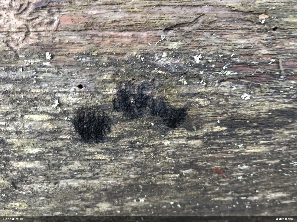 Ja uz beigta koka, tad ticamākā laikam ir B.affinis var. microspora, lai gan tā aug uz mizas. Bet varbūt tieši apakšā gļotsēnēm ir kādi mizas fragmentiņi?