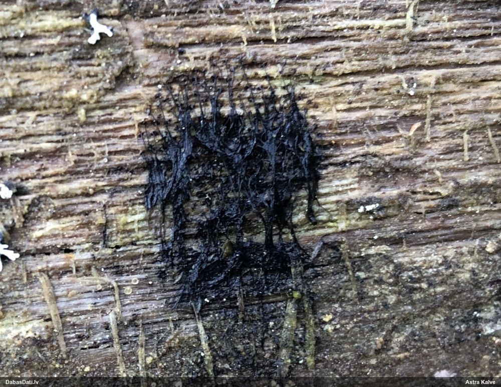 Ja uz beigta koka, tad ticamākā laikam ir B.affinis var. microspora, lai gan tā aug uz mizas. Bet varbūt tieši apakšā gļotsēnēm ir kādi mizas fragmentiņi?