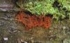 Man pēkšņi radās ideja - vai tur bija nu ļoti mitrs mikroklimats, egle ar melnalksni? Hipotētiski tādas dzeltenas var būt Diachea muscorum. Te bilde ir mazliet līdzīga: https://fr.wikipedia.org/wiki/Fichier:Craterium_muscorum,_Trawscoed,_North_Wales,_Aug_2016_-_Flickr_-_janetgraham84.jpg