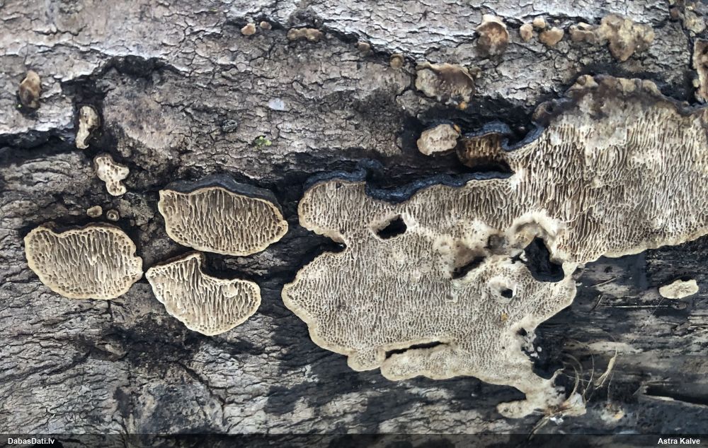 Ja uz beigta koka, tad ticamākā laikam ir B.affinis var. microspora, lai gan tā aug uz mizas. Bet varbūt tieši apakšā gļotsēnēm ir kādi mizas fragmentiņi?