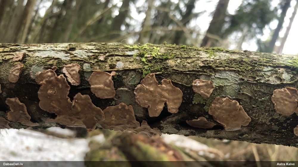 Ja uz beigta koka, tad ticamākā laikam ir B.affinis var. microspora, lai gan tā aug uz mizas. Bet varbūt tieši apakšā gļotsēnēm ir kādi mizas fragmentiņi?