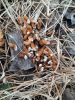 Satrūdējusi kritala mežā, nav dēļi. Iespējams, egle, jauktu koku mežs.