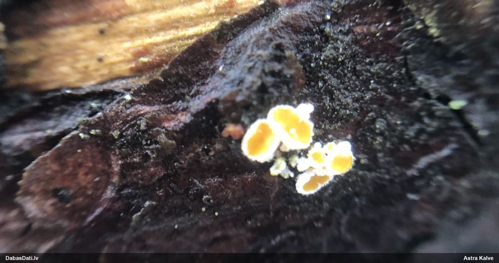 Man pēkšņi radās ideja - vai tur bija nu ļoti mitrs mikroklimats, egle ar melnalksni? Hipotētiski tādas dzeltenas var būt Diachea muscorum. Te bilde ir mazliet līdzīga: https://fr.wikipedia.org/wiki/Fichier:Craterium_muscorum,_Trawscoed,_North_Wales,_Aug_2016_-_Flickr_-_janetgraham84.jpg