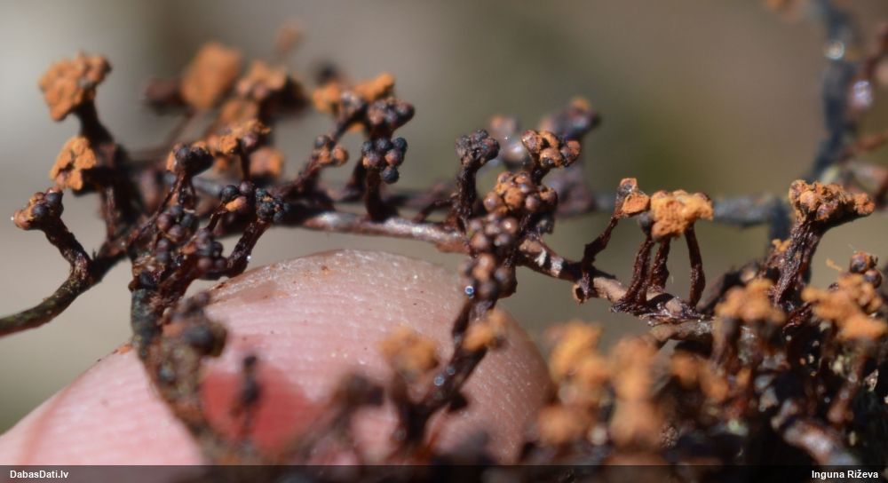 Priekš aurantiaca galīgi neatbilst jaunu augļķermeņu krāsa (kam sākumā jābūt zaļgani dzelteniem). Variants ir C.intricata, bet te mikroskopijā grūti saskatīt brīvo galu skaitu mezglos, tāpēc ātrumā droši noteikt nevaru.
