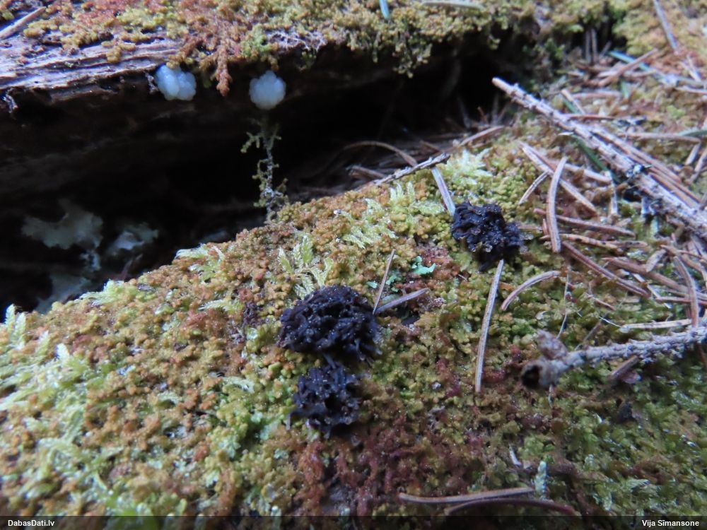 Man pēkšņi radās ideja - vai tur bija nu ļoti mitrs mikroklimats, egle ar melnalksni? Hipotētiski tādas dzeltenas var būt Diachea muscorum. Te bilde ir mazliet līdzīga: https://fr.wikipedia.org/wiki/Fichier:Craterium_muscorum,_Trawscoed,_North_Wales,_Aug_2016_-_Flickr_-_janetgraham84.jpg