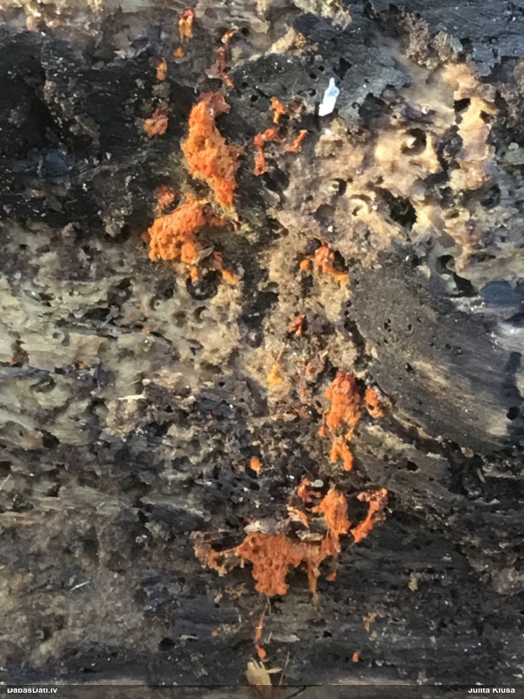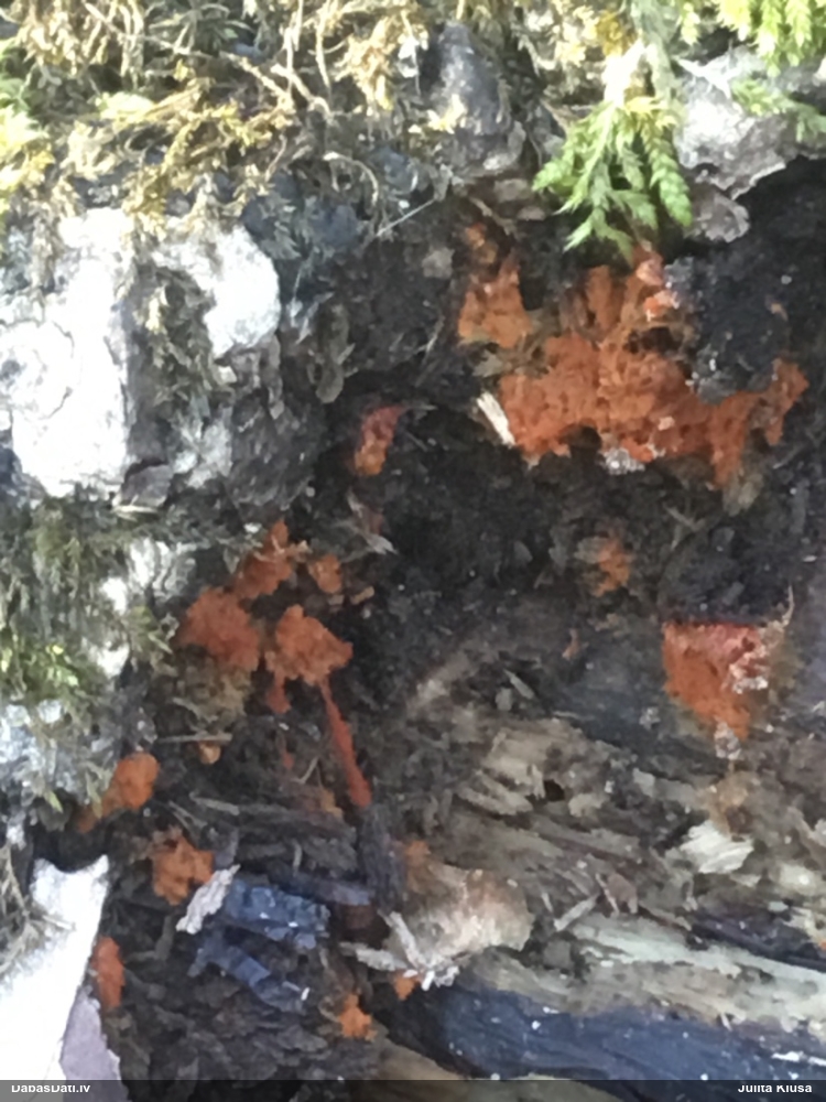 Mazie dzīves prieciņi! :) Lūk, pie kā noved cilvēku iedvesmošana uz gļotsēņošanu, nepieciešamas tikai pareizi iestatītas un sugu redzošas acis. Paraugs tika ķidāts ar pietāti, vēl ir pietiekami daudz materiāla. Atrašanai noteikti jāizmanto 40x lupa ar gaismiņu, bez tās neiztikt. Konkrētā sveķainā egle atšķīrās no visām pārējām, bija noliekusies 45 grādu lenķī, pasargāta no tiešiem nokrišņiem. Īpaša uzmanība jāvelta samtaini melnajam micēlijam, ar ko noklātas senas sveķainas rētas. Ja tiek ieraudzīti gļotsēnes augļķermeņi, tad viss uzreiz kļūst skaidrs. Tie ir pietiekami izteiksmīgi. Novēlu veiksmes visiem, kuri vēlas šo būtni ieraudzīt savām acīm! Vakar pārskatīju arī citas DMB audzes, tomēr bez sekmēm. Tomēr prasības pret dzīvotni nav gluži izšķirošas, Dānijā atrasta arī stādītās mono-audzēs. Jāturpina meklēt retās sugas :)