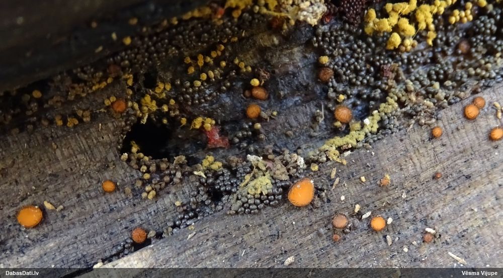 Nu jāā.. Pēc kopskata domājams, ka ļoti reti novērota suga, pēc pašreizējām zināšanām - Badhamia foliicola vai Physarum cinereum. Bet dikti agri! Varētu šogad papētīt, vai tur kas līdzīgs neuzaug. :D