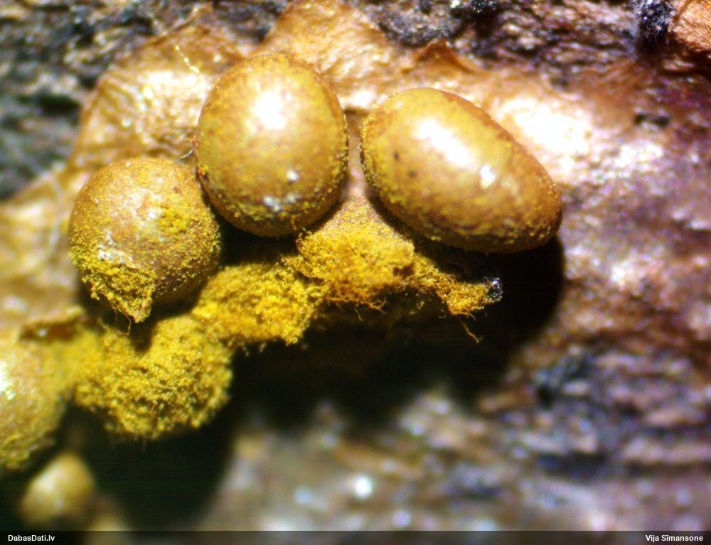 Paldies, Raivo! Ar acu gaišumu man arvien sliktāk, bet mikroskops palīdz. Jā, gribēju teikt, ka paraugam, ja vien nav kāda jutīga atradne, kurai drīkst ievākt tikai mazu gabaliņu, vērts ievākt lielāku gabalu, jo gļotsēnēm patīk kompānija. Un mikroskopa mazajos palielinājumos ar sānu papildus apgaismojumu ir vērts rūpīgi "izstaigāt" visu paraugu. Arī ķērpjus un interesantas sīksēnītes tā var atrast, ko dabā nepamanītu. Ar kriksītēm ir dažādi - pirmās es tā arī tikai citu sugu paraugos pamanīju, bet vēlāk redzēju arī dabā kriskīšu plantācijas - ja to ir daudz, tad var pamanīt jau dabā. Uz sūnām gan ir ekstrēms gadījums, dabā droši nepamanītu, arī eksemplāra noņemšana no sūnas nebija pārāk veiksmīga, tāpēc par noteikšanu mazliet šaubos (sporām mazliet cits tonis). Bet pagaidām citas hipotēzes nav (un konkrētā eksemplāra arī vairs ne).