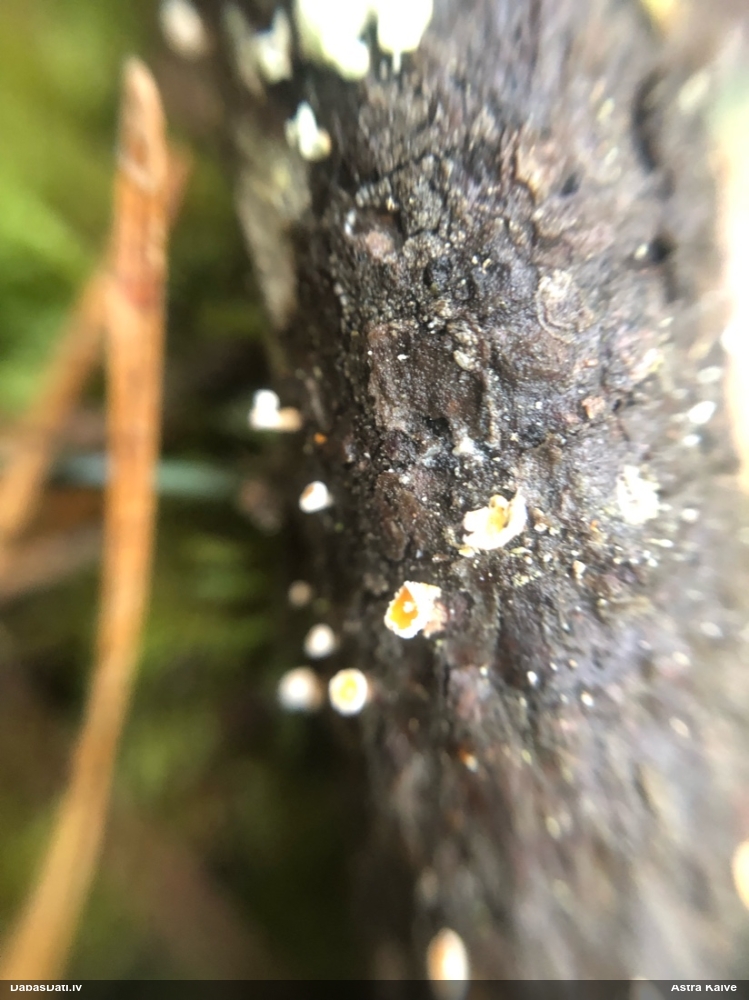 neatceros, kad tik ļoti nevarējusi sagaidīt mikroskopēšanu savam paraugam, kas identisks ar šo novērojumu. Mizaine ir. Vistuvāk no tā, ko paguvu izpētīt, tiešām kārpainā mizaine, bet kapilīcijs, manuprāt, ir mazliet citādāks, nemaz nerunājot par to, ka tā ļoti daudz un pat staipīgs (kārpainajai kapilīcijs maz un nestaipās). Un Neuberta aprakstā tikko iztulkoju par substrātu "Tā substrāts ir gandrīz tikai lapu koku miza, tikai vienā Picea gadījumā, dažreiz arī uz sūnām". Bet mums abām ir pārliecinošas egles un kopīgs izskats, kas atšķiras no kārpainās, nu neticu, ka varētu būt kārpainā. Ticamāk, ka zinātnei jauna suga :D. bet es vēl papētīšu, varbūt kaut kur tomēr ir kas tāds aprakstīts.