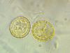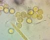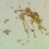 Ko pēc mikroskopētā var secināt: * sporas ir tumšas, tātad ir cukurīšu (Didymiaceae) vai pumpurīšu dzimta (Physaraceae) * sporas ir gan plusmīnus apaļas, gan garenas, gan vēl visādi izlocītas, tātad paraugs nav pilnvērtīgi nobriedis, jo normāli sporām jābūt visām līdzīgas formas, katrā ziņā vismaz pret vienu asi simetriskām. Ja ir nepilnvērtīgi nobriedis paraugs, tad sporu izmēram jāņem mazākās simetriskākās sporas. Šajā gadījumā normāli būtu jābūt apaļām sporām, tāpēc garenajām nevajadzētu mērīt pa garāko diametru. Labāk pamaklēt iespējami apaļākās sporas. * Ja sporas ir deformētas, tad mērījumus vajag veikt vairākkārtīgi, nu vismaz 3 reizes, vai nu tajā pašā mikroskopijā vēl arī pavisam citā vietā, vai labāk pavisam jaunu porciju sporu paņemt no tā paša (ja maz augļķermeņu) vai vēl labāk no kāda hipotētiski labāk nobrieduša augļķwermeņa. Tad varēs labāk nojaust, cik varētu būt normālu sporu diametrs, resp., vai visos gadījumos ir līdzīgi izmēri, vai arī tie ļoti "lēkā", tad jāskatās, kurā gadījumā bija normālākās (tipiski arī mazākās) sporas. * Pēc attēlā ar mērījumiem redzamā es secinātu, ka sporu izmērs orientējoši ir 12-13 mkm. Sporām vērts mērīt (secināt) ar precizitāti līdz 0,5 mkm, lielākai "precizitātei" nav jēgas, jo tur nāk klāt arī mērījuma kļūda. Tomēr te ir tikai viens mērījums dažām redzamām sporām, tāpēc droši pateikt nevar. * Tumšsporainajām ļoti svarīgs ir sporu raksts, kuru var palaimēties nomanīt arī nepilnīgi nobriedušām sporām, kas reizēm "glābj", ja sporu izmēru precīzi grūti pateikt. Ļoti nenobriedušām sporām diemžēl arī raksts mēdz būt nenobriedis. Konkrētajā gadījumā, ja tiešām būtu jāizšķiras starp Physarum psittacinum un Diderma tigrinum (es patiesībā cerētu vispār uz jaunu sugu Latvijai), tad būtu jāsaskata, vai ir vienmērīgi izvietotas kārpas (Diderma tigrinum) vai kārpas ar tumšāku kārpu grupām (Physarum psittacinum). Mikroskopijā es kārpas īsti neredzu vispār, tāpēc man ir jautājums, vai tas ir tāpēc, ka sporas pagalam nenobriedušas (it kā tik traki nevajadzētu būt) vai arī mikroskopijā nav pareizi fokusēts (vajag fokusēt šauri uz sporas centru, lai redz rakstiņu) Attiecīgi par sporu rakstu es neko nevaru pateikt. * kapilīcijs gļotsēņu "pamatu" noteikšanai (kāda dzimta, ģints) ir pats svarīgākais. Ja nav kapilīcija, tad var noteikt tikai dažos izņēmuma gadījumos (lielākoties vienkāršos, vai ja ir liela pieredze). Sporas var izskatīties identiskas arī dažādu dzimtu gļotsēnēm. Lai tiktu pie kapilīcija, sarežģītākos gadījumos uz stikliņa jāņem iespējami viss augļķermenis un, tā kā tas var būt "biezs", tad to starp stikliņiem "izsmērē" tiktāl, lai sāk atsegties (mikroskopijā kļūst redzamas) iekšējās struktūras. Jāredz vismaz kaut kādas daļas, krāsa. Ja tā būtu olīte (Diderma), tad kapilīcijs būtu skaidri brūni-balti pavedieni. Ja tā ir pumpurīte (Physarum), tad pavedieni ir caurspīdīgi un var būt ļoti grūti saskatāmi. Tad jāmeklē kapilīcija mezgli, kas ir apaļu kaļķa granulu sakopojumi. Ja paraugs kārtīgi tiek "izsmērēts" tad tie mezgli arī var "izsmērēties", tad vnk redz, ka paraugs pilns ar apaļām kaļķa granulām (tās redzamas arī šajā mikroskopijā). Vispār apaļas kaļķa granulas ir arī olītēm (uz galviņas), tāpēc pašas par sevi tās neliecina vienas vai otras dzimtas virzienā. Pumpurītēm (Physarum) parasti kapilīciju (t.i., tā mezglus) saskata mazos palielinājumos mikroskopā, vēl neliekot paraugu starp stikliņiem. Tikai jābūt atsegtām iekšējām struktūrām. Tad redz, ka ir tādi kaļķa sakopojumi iekšpusē. Gala secinājumi no tā, kas jau ir redzams - paraugs ir nepilnīgi nobriedis, kas pēc sporu izmēriem vairāk atbilstu Diderma tigrinum (vajag 10-13µm, bet redzamās 12-13µm nepilnīgi nobriedušām sporām ir ļoti atbilstošas), taču olītēm kapilīcijam būtu jābūt vieglāk ievērojamam, tomēr tā te nav. Priekš Physarum psittacinum sporas ir stipri par lielu, ar tādām novirzēm sugu noteikti nevarētu apstiprināt, turklāt būtu jāsaskata tumšāku kārpu grupas. Bet es nepavisam negribētu apstāties pie šīm divām hipotēzēm, kurām biotops īsti neatbilst. Varbūt ir kāda mums mazāk zināma ģints, tāpēc ļoti labprāt saņemtu paraudziņu 28. martā. Tik gari rakstu arī priekš sevis, jo grāmatai man svarīgi saprast, ko iesācējam (un ne tikai) svarīgi izskaidrot, lai tiktu līdz rezultātam. Visi "parastie" noteicēji ir gadījumiem, ja ir visas sastāvdaļas zināmas, un kapilīcijs ir visupirmais.