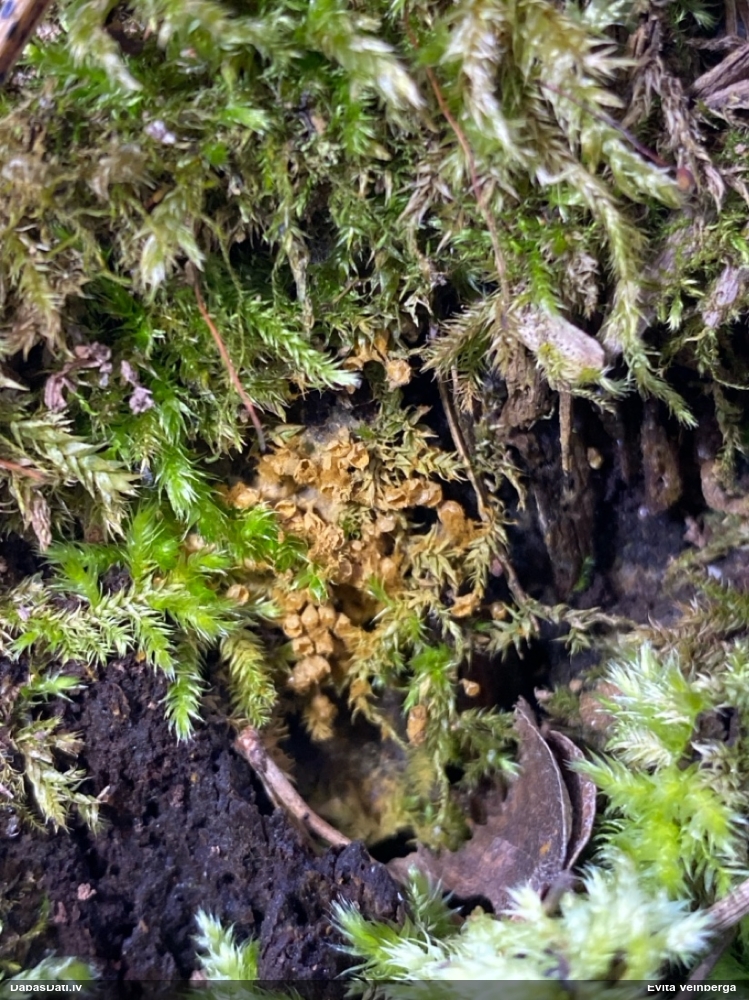 Man pēkšņi radās ideja - vai tur bija nu ļoti mitrs mikroklimats, egle ar melnalksni? Hipotētiski tādas dzeltenas var būt Diachea muscorum. Te bilde ir mazliet līdzīga: https://fr.wikipedia.org/wiki/Fichier:Craterium_muscorum,_Trawscoed,_North_Wales,_Aug_2016_-_Flickr_-_janetgraham84.jpg