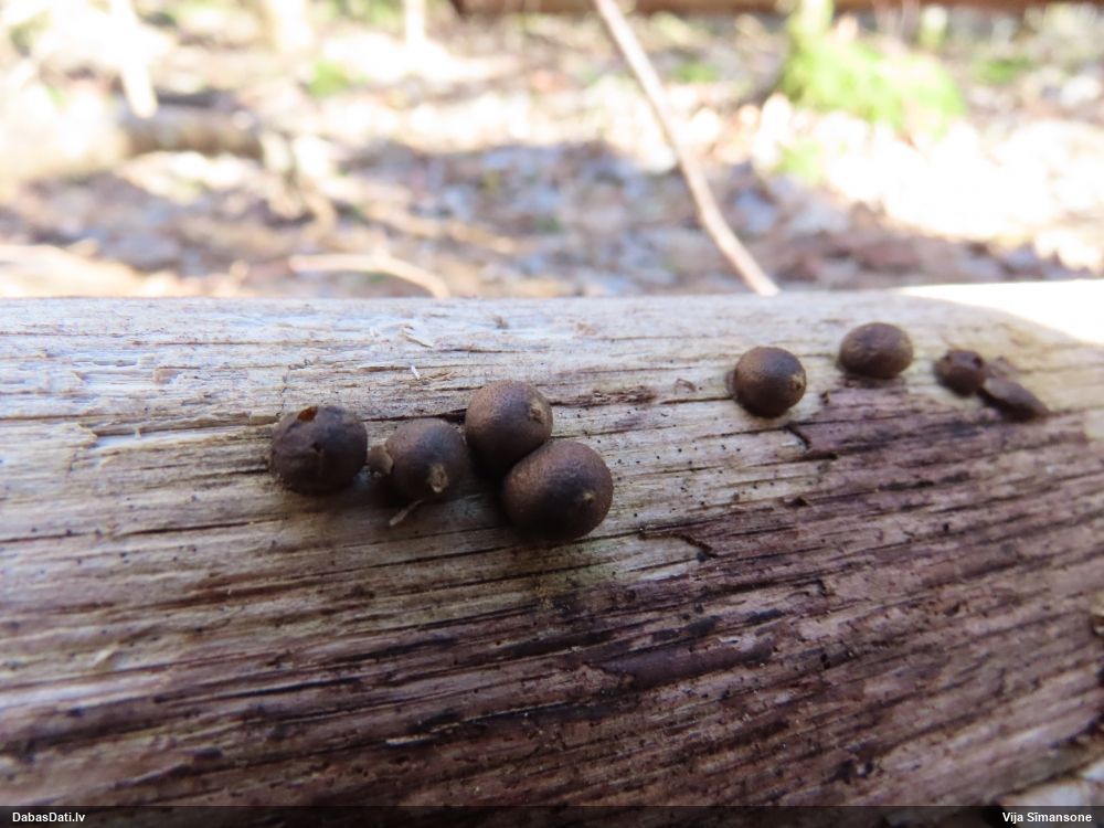 Šobrīd varu iedomāties 2 variantus - melnā plaispika Amaurochaete atra vai parastais gļotpūpēdis Reticularia lycoperdon. Pēc izmēra, augšanas laika un augšanas uz apstrādāta koka atbilst abas.