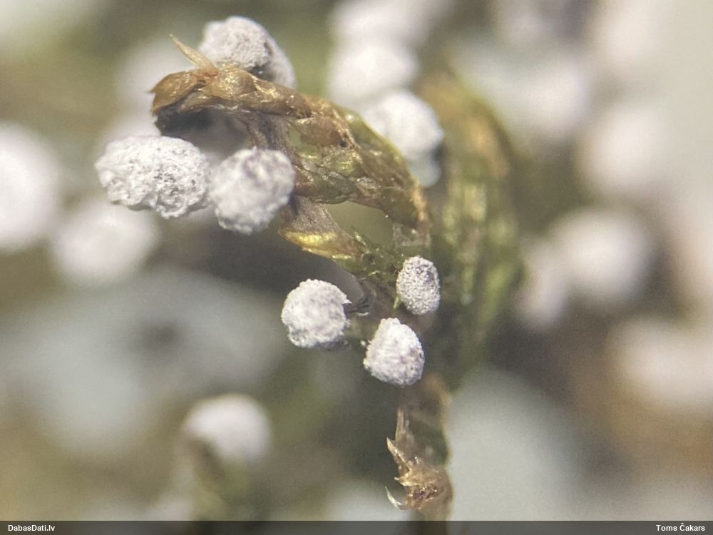 Raivo, nebūs Chaenotheca furfuracea, bet gan C.brachypoda (dabisku mežu indikatorsuga). C.furfuracea ir ar izteiktu laponi, daudz lielāki aķ un košāk zaļa krāsa