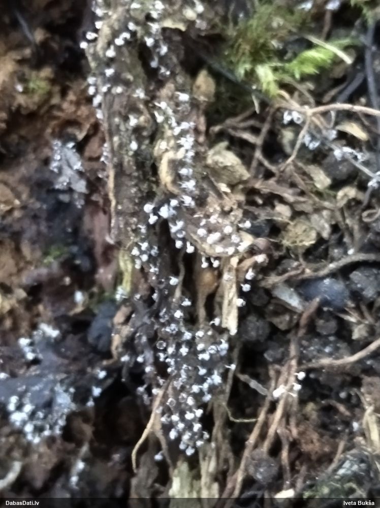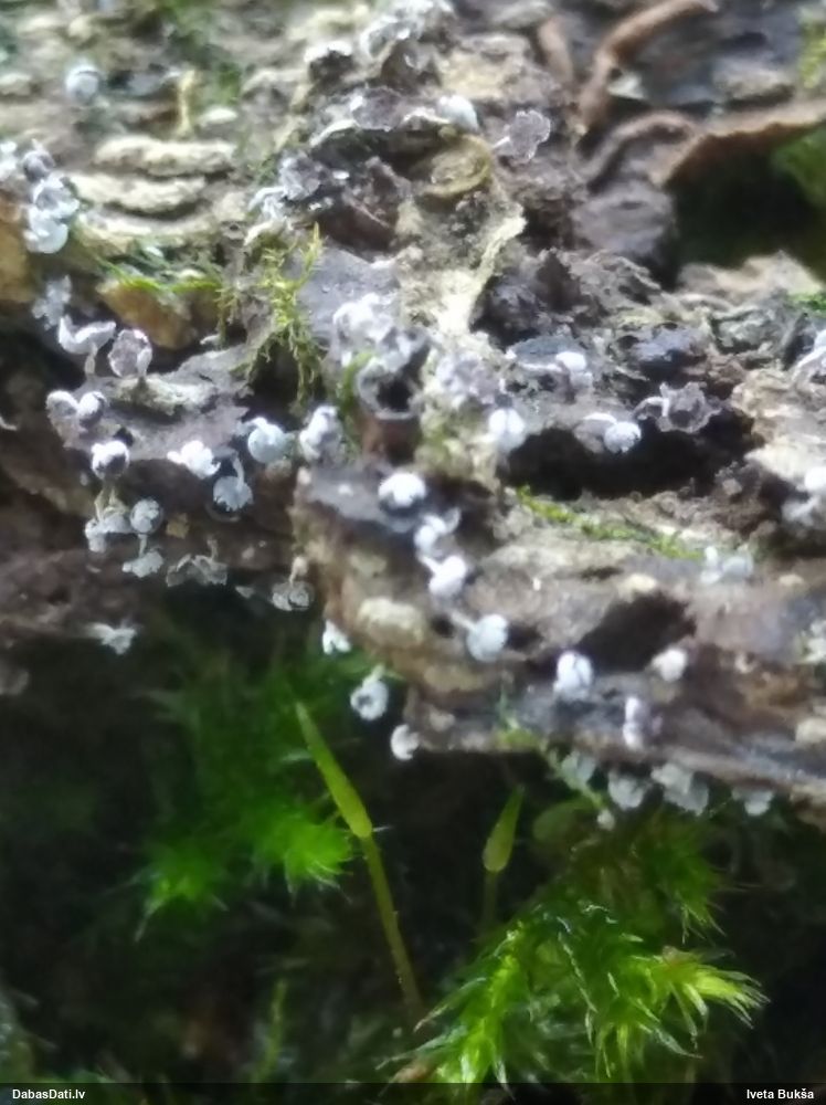 Ja uz beigta koka, tad ticamākā laikam ir B.affinis var. microspora, lai gan tā aug uz mizas. Bet varbūt tieši apakšā gļotsēnēm ir kādi mizas fragmentiņi?