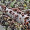 Sveiciens. Ieziņotā sugas atradne tika apmeklēta un noteikta līdz taksonam. Tā ir Sclerophora peronella (Ach.) Tibell. Nagliņas 0,7 - 0,8 mm garas, askusporas apaļas, vidēji 3,2 µm diametrā (n=16). Viena no retākajām ģints pārstāvēm. Vērtīgs ziņojums :) Biju patīkami pārsteikts - konkrētais sausoknis vēl bija savā vietā pēc vairāk nekā sešiem gadiem, ņemot vērā cik zibenīgas ir pašreizējās ainavas pārmaiņas. Uz blakus vīksnas sausokņa arī retā suga Trametes gibbosa, uz muzeja ēkām arī daudz reto nagliņu. Dvēseliska un iedvesmojoša vieta :)