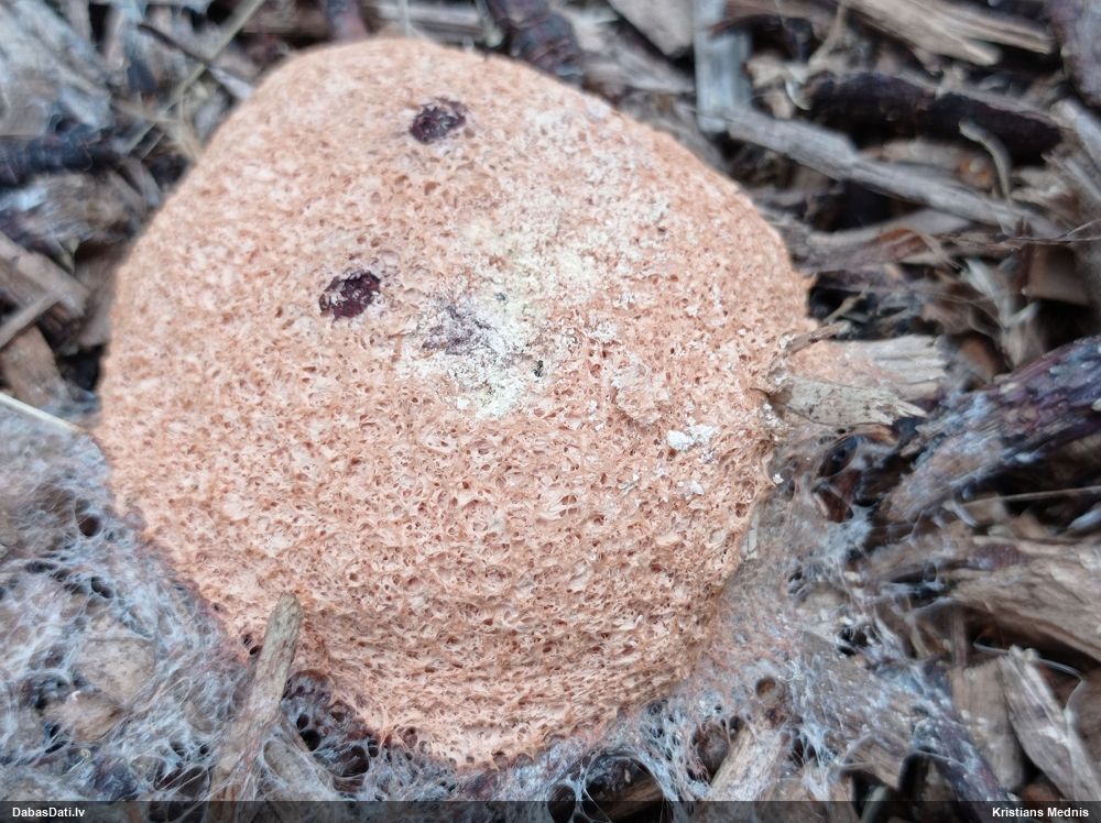 Šim Vijas paraugam iekšas precīzi tādas pašas - baltdzeltenas, ar kapilīciju ar maziem mezgliem, un virsma balta. Sporas gan lielākas: https://dabasdati.lv/lv/observation/b146f03a39b8789e2897007d9e464255/