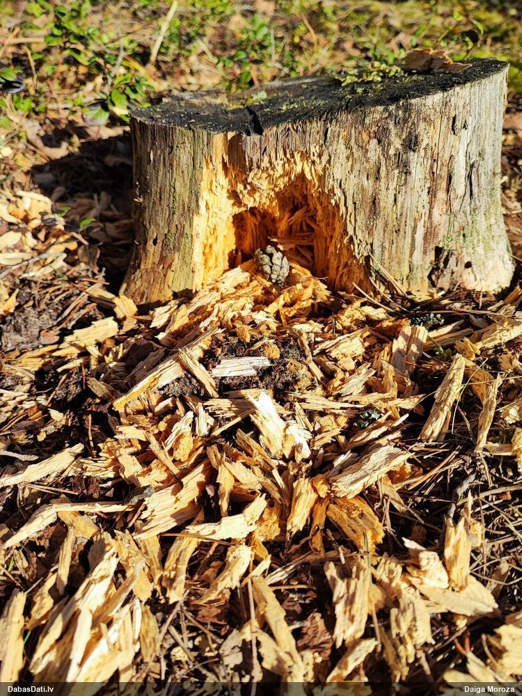 Satrūdējusi kritala mežā, nav dēļi. Iespējams, egle, jauktu koku mežs.