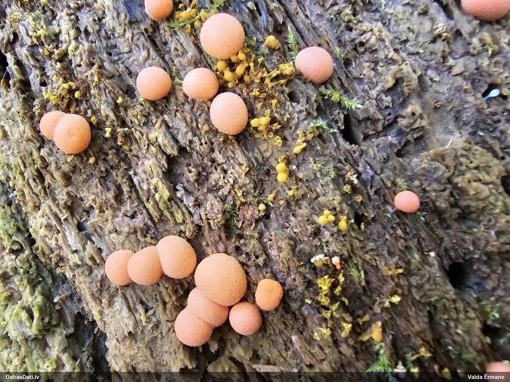 Paldies, Iveta! Julita, kā redzi – nevis dzīvs, bet tikai pusdzīvs ;) Par atrašanu – joprojām darbojos pēc principa bez piecām/sešām atrastām sugām no 250x250 m kvadrāta ārā neiet. Ja nav kritalu – rāpoju pa sūnām. Šis bija viens no kvadrātiem bez sugām, izvēlējos kritalu, tā bija patukša, blakus kritalai pamanīju šīs gļotsēnes. Beigās šajā vietā esmu iesprūdis, būs vēl daži interesanti atradumi. Tik jāatrod laiks mikroskopēšanai, sugu noteikšanai un salikšanai DD. Laika kā reiz šobrīd ļoti maz un brīvajos brīžos drīzāk gribas atkal aizskriet uz savu sūnu pleķi :) Par nosaukumu – domāju, ka rīkojamies līdzīgi kā ar Tavu Diachea (bij. Craterium) muscorum – tā kā šai sugai mums nav iegājies krāterītes nosaukums, saucam par vizulīti. Kaut, piekrītu, drīzāk izskatās pēc krāterītes.
