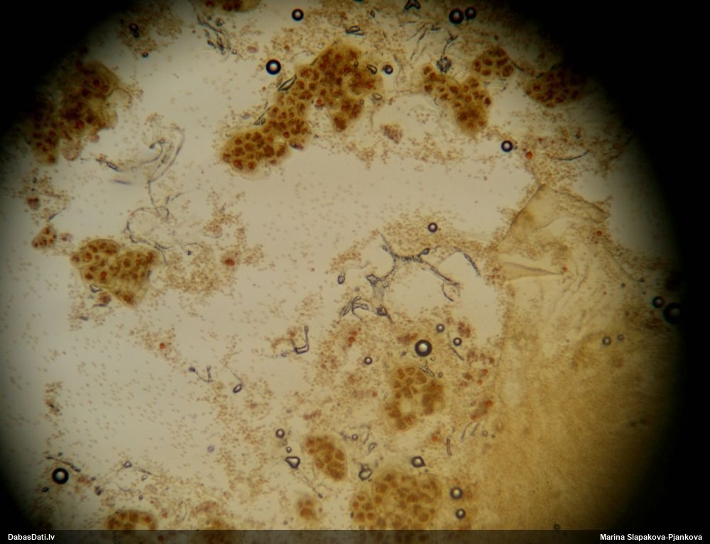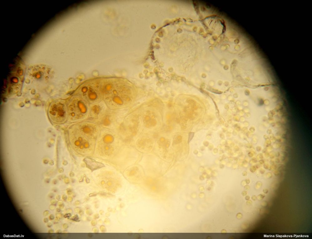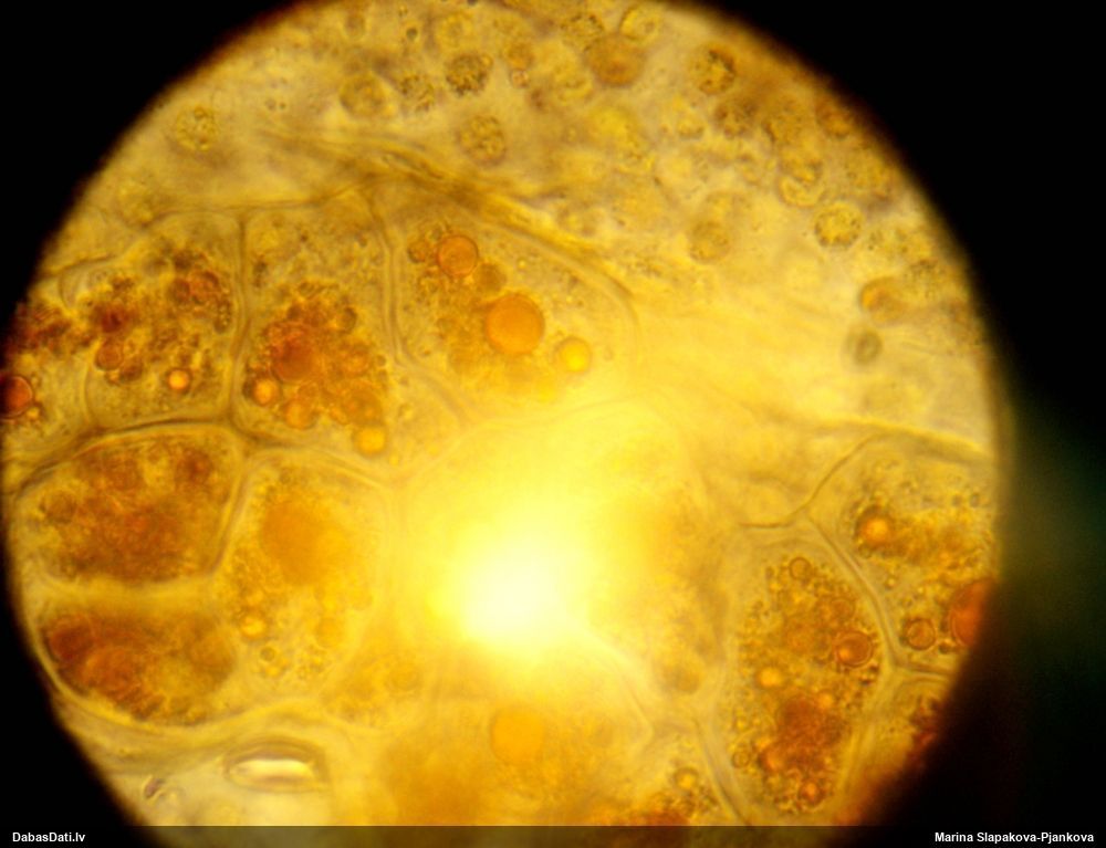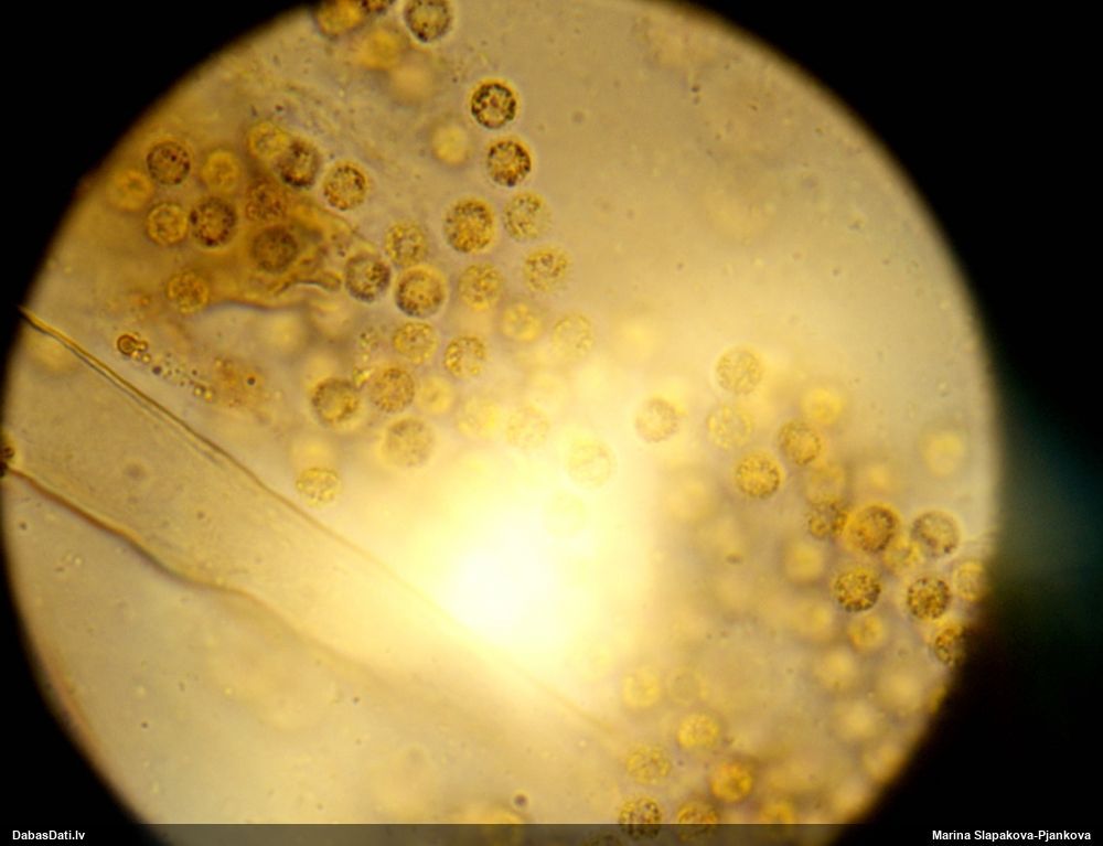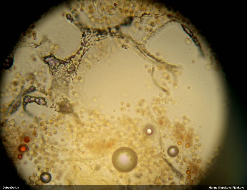 Pētīju vairākas vilkpienaines, bet tās manā skatā smukākās polarizētajā gaismā neatbilda prognozēm un pagaidām neko neizdevās noteikt. Šo skatīju tikai tāpēc, ka gadījās "pa rokai", bet te izrādījās ļoti daudz kristālu, un arī sugai raksturīgā dzintardzeltenā krāsa mikroskopijā, un visas pazīmes noteikšanai sanāca. Suga arī esot salīdzinoši vieglāk nosakāma.