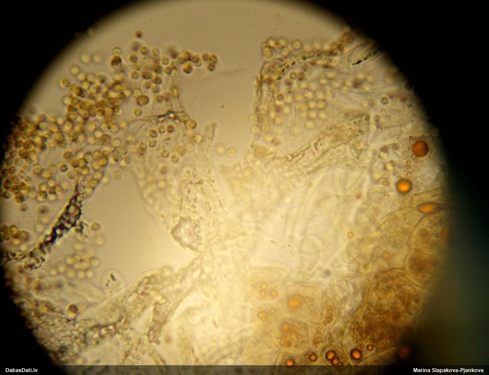 Jā, tā vajadzētu būt. Izdevās arī izķidāt kolumellu, tikai bildes gan nav diez cik veiksmīgas. Man liekas, ka nav īsti pareizi attīstījies, jo ir daudz ļoti gaišu sporu, kam arī kārpas, šķiet, nav noformējušās. Iespējams, tāpēc arī ir tās tumšās - pietrūcis kaļķa..