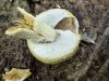 Izskatās, ka pa virsu pelējums, tāpēc neko saprast nevar. Sporas arī attiecīgi traumētas un grūti saprotamas. Ja pašai būtu paraugs, saprastu labāk. Bet vai varētu noteikt - nezinu. Jautājums, cik daudz iekšu sēne ir apēdusi. Nevar saprast, vai mikroskopijā redzamie baltie pavedieni ir gļotsēnei vai sēnei.